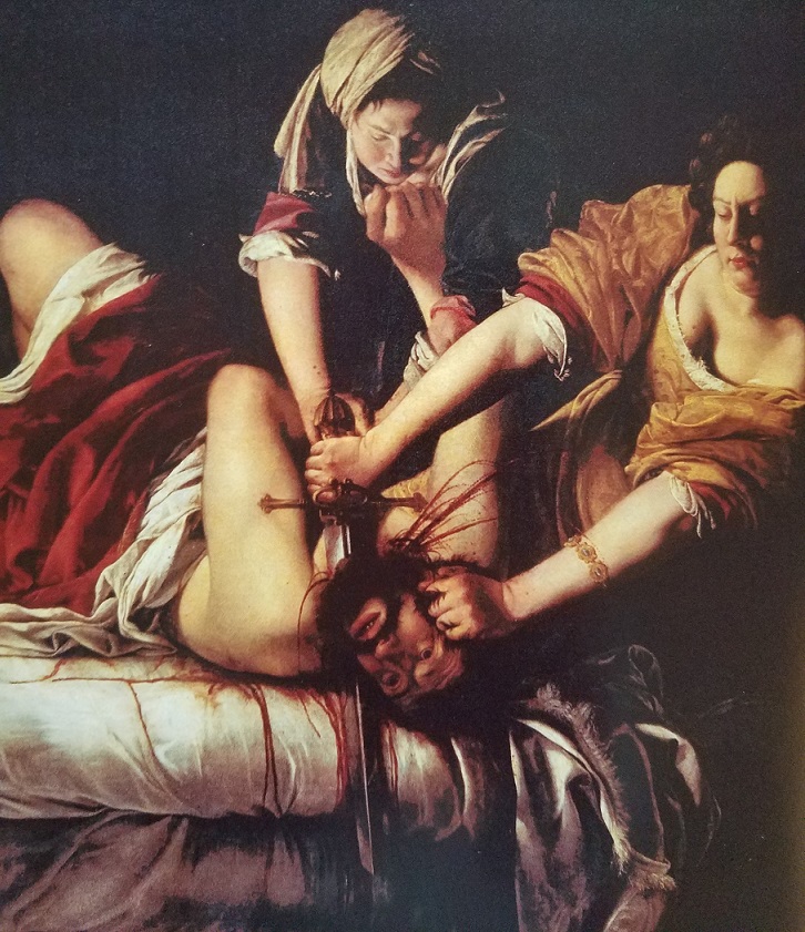 Its far more than mere coincidence that one of Artemisia’s recurring themes in her work is female strength and the importance of solidarity among women. We can witness the physical and emotional strength her brush strokes bestowed on the two female characters in her multiple renderings over the years of Judith Beheading Holofernes, a favorite subject of her time.